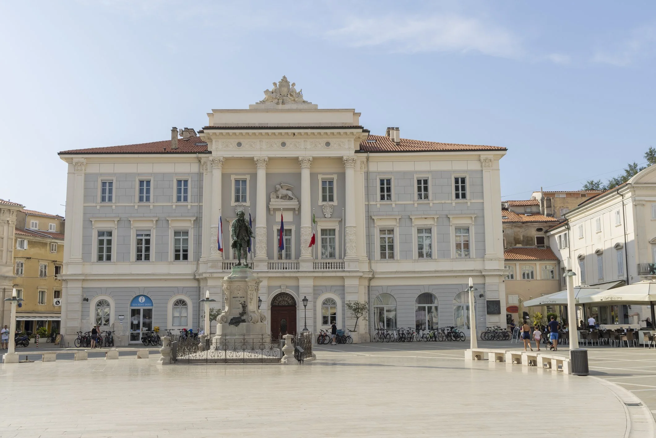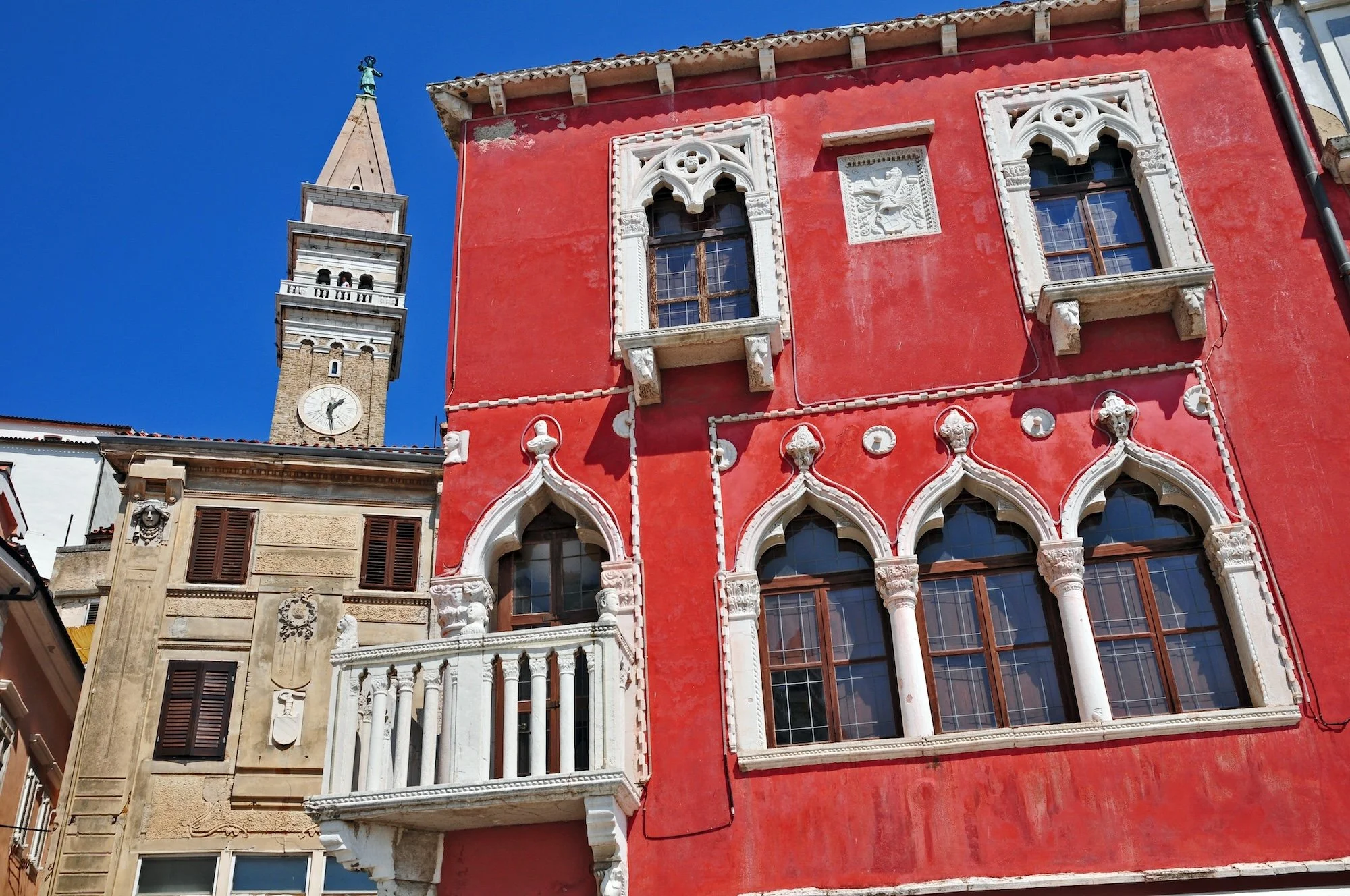 The town sits on a narrow peninsula pushing into the Gulf of Trieste, Venetian to its bones. Gothic arches frame slices of blue sea at the end of every side street, and the bell tower of St George – modelled directly on the Campanile of San Marco – rises above the rooftops as it has for four hundred years. In the centre, Tartini Square – named for the Baroque violinist Giuseppe Tartini, who was born here in 1692, when Piran was still unmistakably Venetian – is where the town's civic life still gathers. On its northern edge stands the Venetian House, a fifteenth-century Gothic palace built, according to local legend, by a Venetian merchant for a young woman from Piran. The townspeople gossiped; the couple had their answer carved into the stone between the upper windows, beneath a lion: Lassa pur dir – let them talk. Five centuries later, the inscription is still there– the gossip has long since stopped.