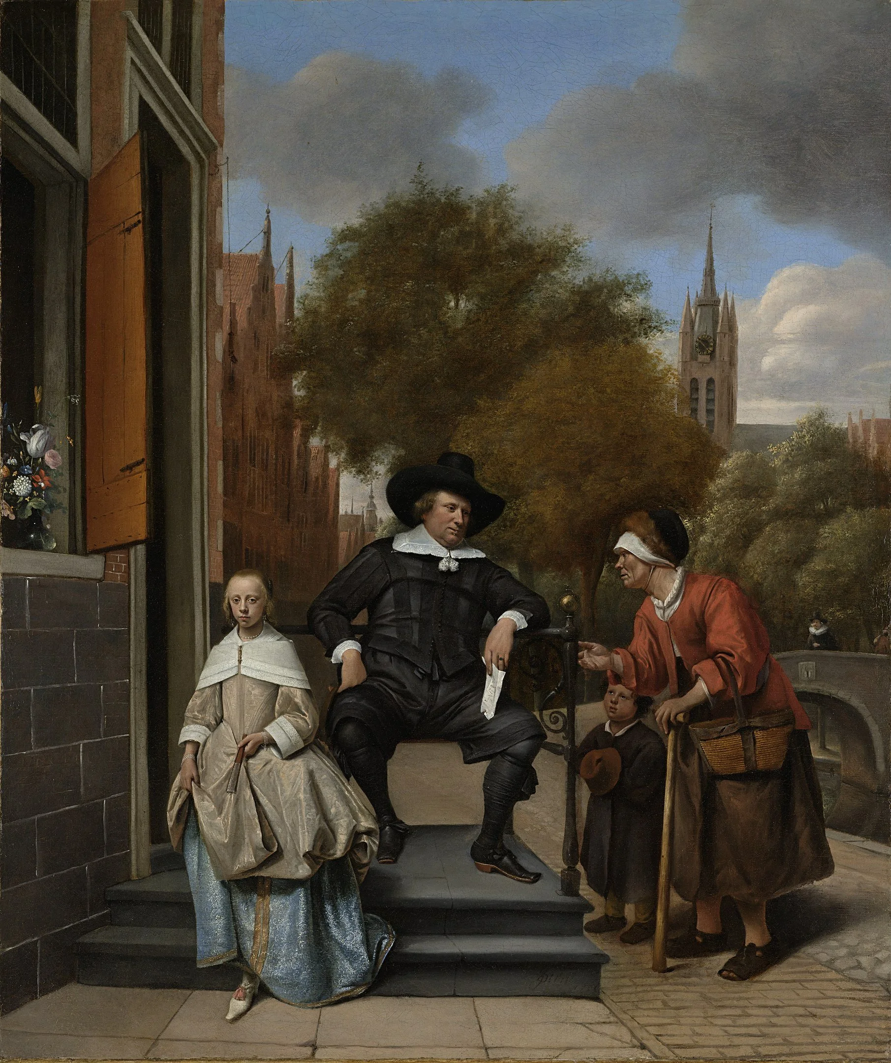 Jan Steen, Adolf and Catharina Croeser, a.k.a. ‘A Mayor of Delft and his Daughter’ (1655), Rijksmuseum, Amsterdam. The artist shows the sitters outside on the Oude Delft canal with the leaning tower of the Oude Kerk in the background for topographical veracity.