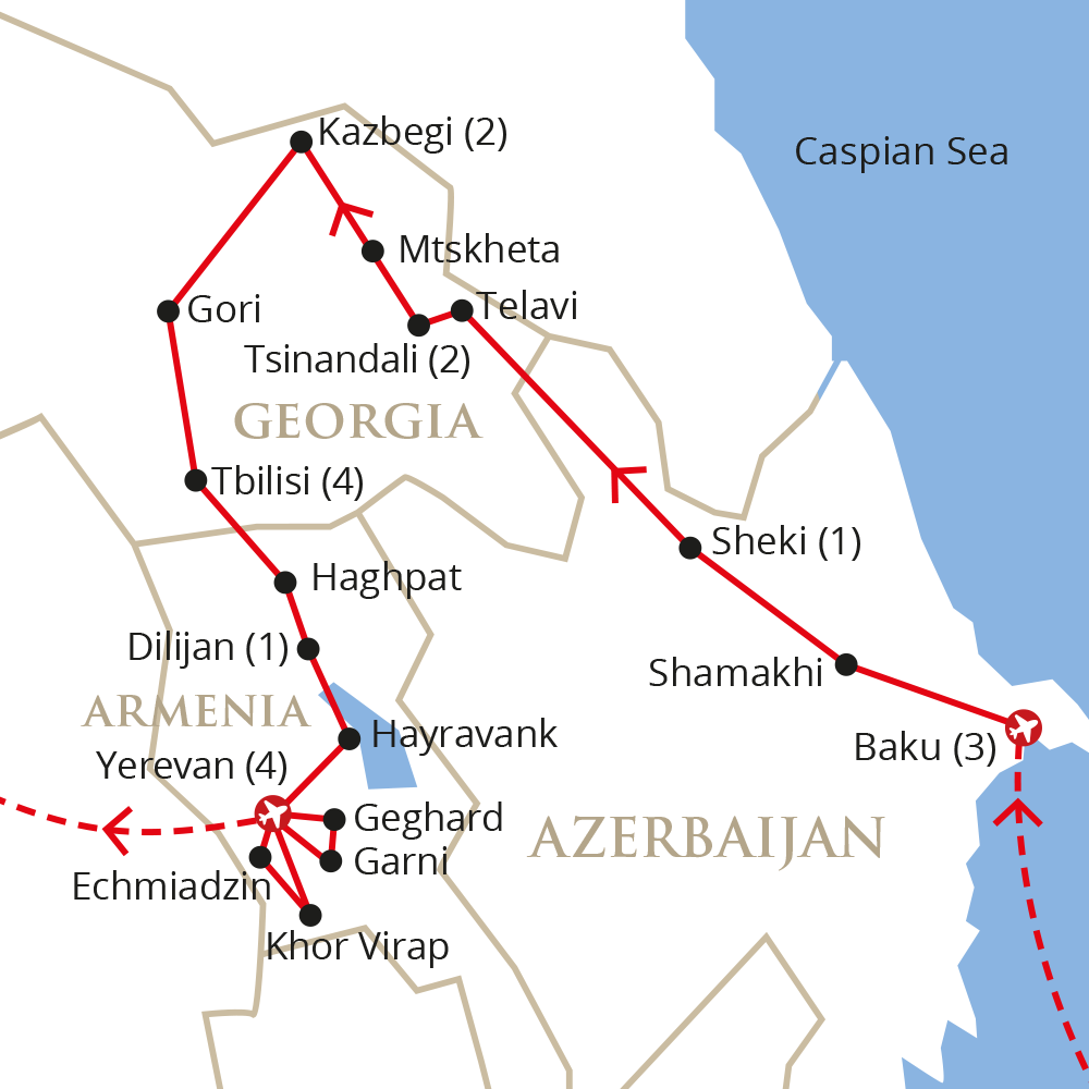 Baku (3 nights), Sheki (1 night), Tsinandali (2 nights), Kazbegi (2 nights), Tbilisi (4 nights), Dilijan (1 night), Yerevan (4 nights)