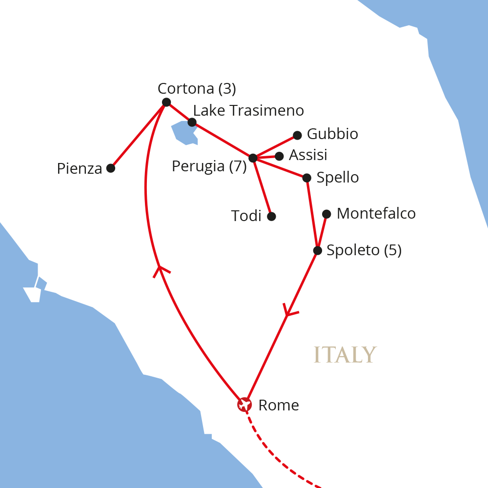 Cortona (3 nights), Perugia (7 nights), Spoleto (5 nights)