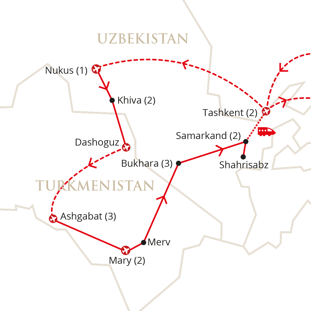 Tashkent (1 night), Nukus (1 night), Khiva (2 nights), Ashgabat (3 nights), Mary (2 nights),